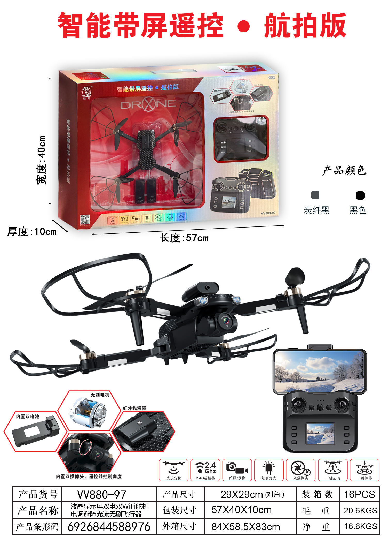 产品名称:液晶显示屏双电双wifi舵机电调避障光流无刷飞行器